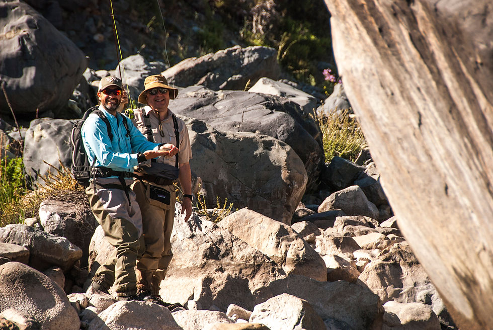 Este rio situado en plena cordillera de la zona central recorre varios kilómetros del cajón del Maipo, y va variando su morfología a lo largo del cauce, lo que se traduce en distintas situaciones de pesca para cada tramo. En su tramo inicial, uno puede pescar truchas Fario en un rio con borde de pasto, estas truchas se esconden en las algas y su dieta se centra en los camarones (Scud) y ninfas de Mayfly. El agua es muy cristalina, lo cual hace que sea una pesca bastante técnica. Sin embargo, este rio no solo tiene ese lugar para capturar una trucha silvestre, también tiene una estructura rocosa en donde habitan grandes cantidades de peces de diferentes tamaños. Las rocas se usan para esconderse de los peces y se recomienda pescar con moscas que imiten ninfas de roca. La gran mayoría son truchas Farios y Arcoíris que no sobrepasan los 600 grs.